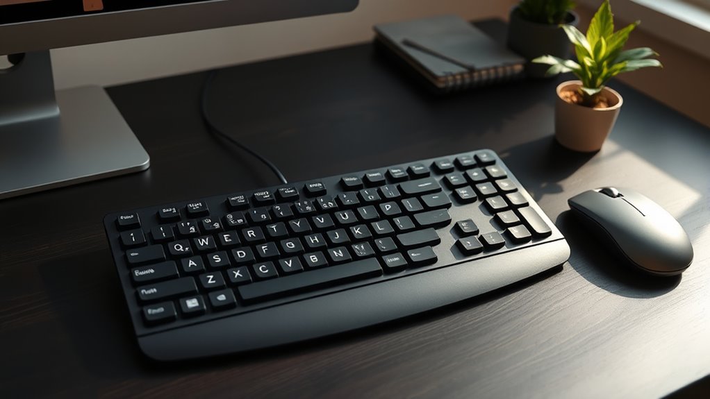 A key factor in picking an ergonomic split keyboard is how easily it can be set up and integrated into your workstation. I look for models that support plug-and-play, so I don’t have to wrestle with drivers or complicated software. Bluetooth pairing or a simple USB receiver connection makes setup quick and hassle-free. Compatibility across Windows, Mac, and Linux is essential, ensuring I can start using the keyboard right away without extra configuration. Minimal setup steps, like automatic recognition and pairing, save time and frustration. I also check that any included software or firmware updates are straightforward to install, so they don’t complicate the initial setup process. A hassle-free setup means I can focus on my work, not on technical issues.