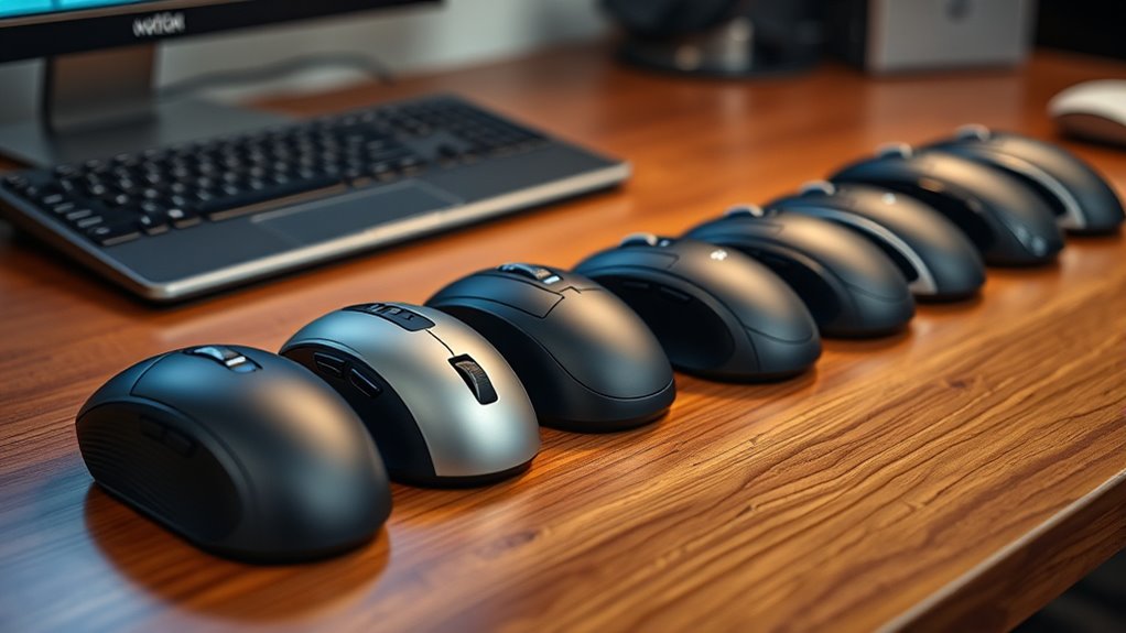 Selecting an ergonomic vertical mouse isn’t just about comfort and size; connectivity options also play a vital role in guaranteeing seamless usability. I look for mice that offer multiple ways to connect, like Bluetooth, 2.4GHz wireless, or wired USB, so I can match my setup. Many models support easy switching between devices—perfect if I use a computer and tablet. Dual connectivity modes, allowing me to connect via Bluetooth and USB simultaneously, add extra flexibility. Rechargeable mice are a plus, freeing me from frequent battery replacements, especially with quick-charging features. Compatibility across operating systems like Windows, macOS, Linux, and Android also matters, depending on my devices. Choosing the right connectivity ensures smooth, uninterrupted work, whether I’m at home or on the go.