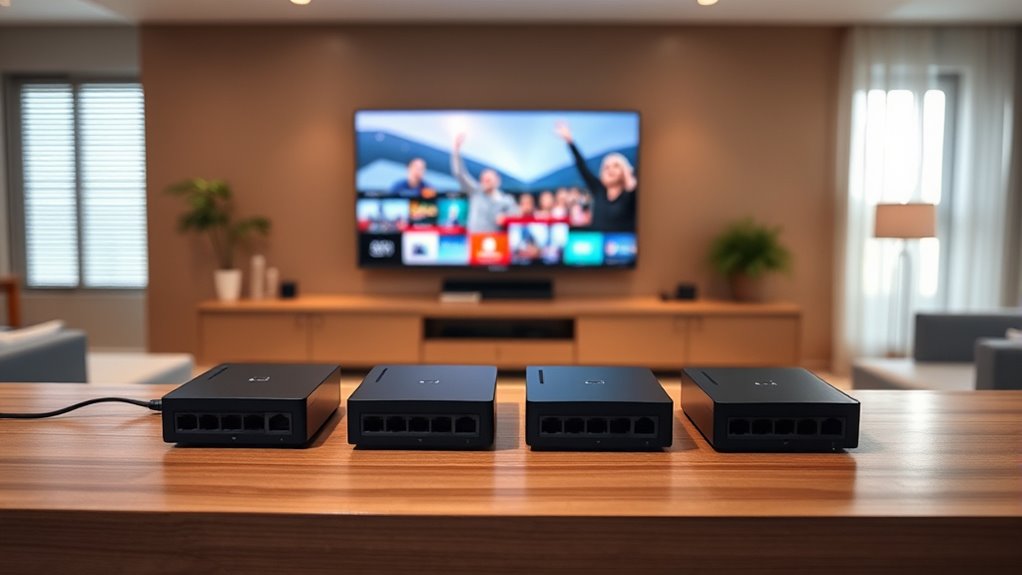 Ethernet backhaul kits need compatible ports and standards to work seamlessly. I check that my router and mesh nodes support Gigabit Ethernet and have available Ethernet ports. I also guarantee the devices follow the same networking standards, like Wi-Fi 6 or Wi-Fi 5, for peak performance. Compatibility is key, so I always verify manufacturer specs and look for models explicitly designed to work with Ethernet backhaul to avoid issues.