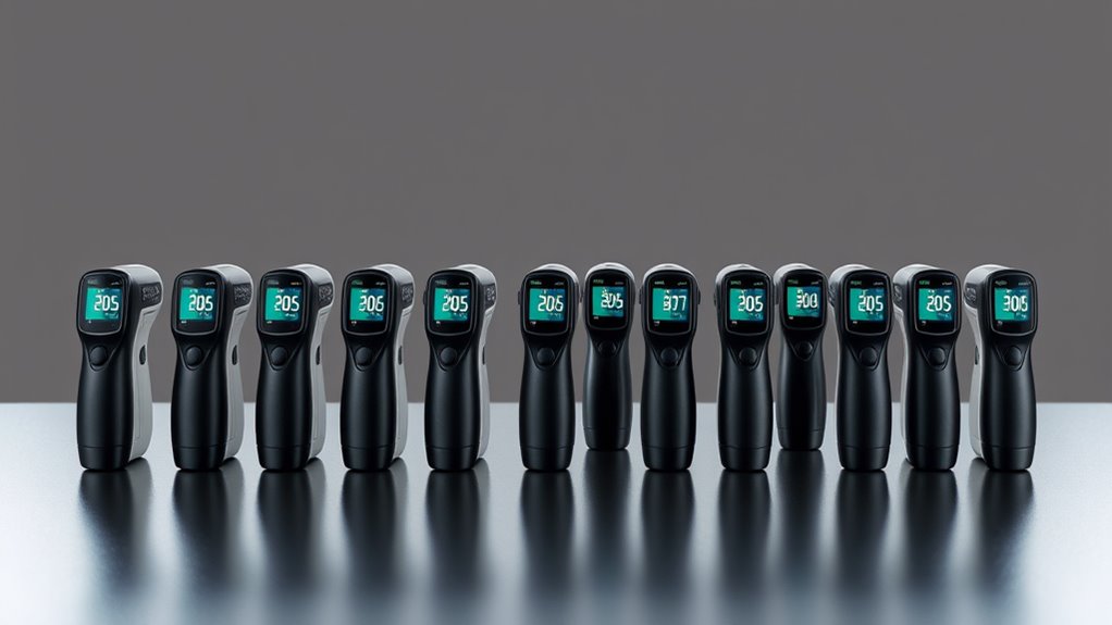 Choosing a fast-read non-contact thermometer hinges on its accuracy, which can vary based on several key factors. Typically, these devices have a margin of error between ±0.2°C and ±0.4°F. Clinical validation is vital, as it confirms the thermometer provides reliable readings, often through calibration against medical standards. Environmental conditions, like room temperature and humidity, can influence measurement accuracy, so stable environments are preferable. Proper measurement technique also matters; maintaining the correct distance and positioning ensures precise results. Thermometers equipped with advanced infrared sensors and optimized algorithms generally offer higher accuracy levels, making them more dependable for quick, reliable readings. When selecting a thermometer, prioritize these factors to guarantee you get consistent, accurate temperature measurements.