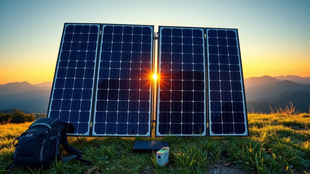 When evaluating foldable solar panels, it’s important to make certain they will work smoothly with your existing setup. First, check that the connectors, like MC4, XT60, or DC ports, match your power station or device inputs. Ensuring compatibility prevents connection issues and streamlines setup. Next, verify the voltage and wattage ratings align with your system’s requirements to avoid overloads or underperformance. It’s also helpful to look for multiple output options, such as USB-A, USB-C, or DC ports, so you can charge various devices simultaneously. Additionally, confirm that any included or available adapters and extension cables are compatible with your equipment. Overall, evaluating the panel’s compatibility with your existing electrical setup guarantees seamless integration and maximum performance.