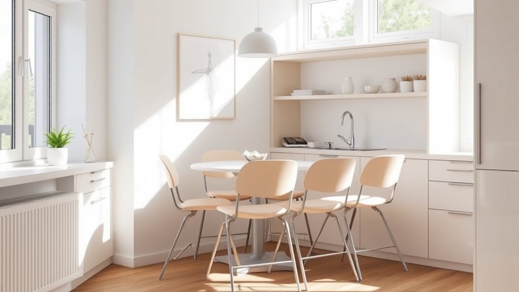When choosing a fold-flat high chair for small spaces, I focus on the compact folding mechanism to guarantee it saves room easily. I also consider how lightweight and portable it is, so I can move it around without hassle. Ultimately, I look at adjustability, safety features, and how simple it is to clean for everyday convenience.