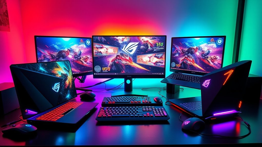 If you’re after the best gaming laptops for 2025, I recommend models with powerful processors like AMD Ryzen 7 5825U or 6850U and high-end GPUs such as NVIDIA GeForce RTX 4050 for smooth, immersive gameplay. Look for at least 16GB RAM, quick SSD storage, and vibrant displays with high refresh rates. Portability, WiFi 6, and solid build quality matter too. Keep exploring, and you’ll discover which options truly stand out for serious gaming.