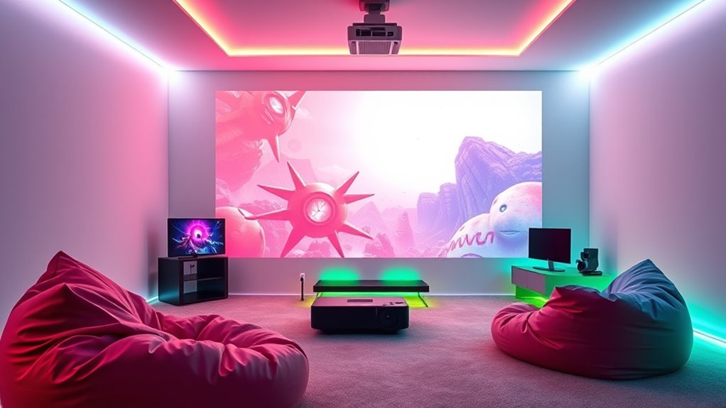 Choosing the right gaming projector is like finding the perfect lens for a camera—once you get it right, every moment becomes crystal clear and unforgettable. I remember setting up my first projector, feeling like I’d just unlocked a new level in my gaming experience. With options like 4K clarity and built-in retro games, you’ll transform your playroom into an epic arena. Trust me, upgrading your projector is the game-changer you didn’t know you needed.