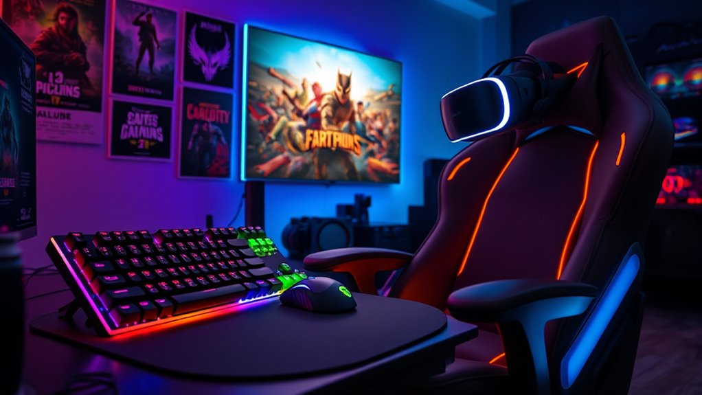 Understanding a gamer’s preferred genre, such as FPS, RPG, or sports, is essential for choosing gifts that truly resonate with their interests. For example, if they love FPS games, consider high-quality gaming headsets or customizable controllers. Knowing whether they prefer console, PC, or mobile gaming guarantees the gift is compatible with their setup. If they lean toward multiplayer experiences, accessories like chat microphones or gaming chairs can enhance their sessions. Recognizing their favorite game series or franchise allows for personalized items like merchandise or limited-edition collectibles. Additionally, understanding their aesthetic preferences—whether they favor realistic graphics or retro styles—helps select visually appealing gifts that match their taste. Tailoring your gift to these genre preferences ensures it hits the mark and elevates their gaming experience.