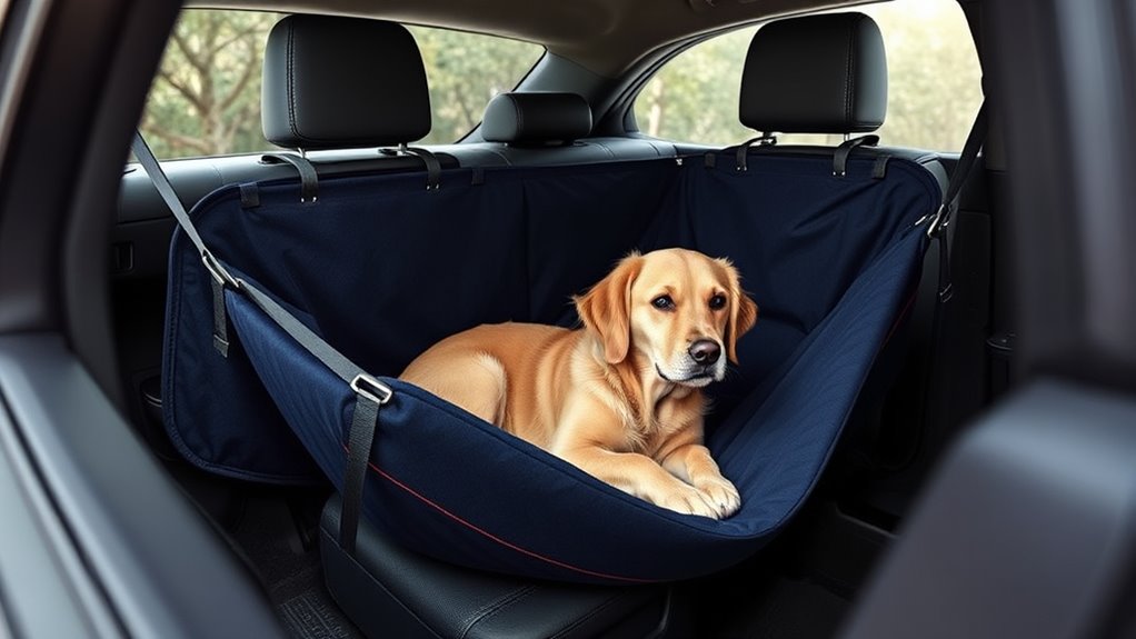 Selecting a hammock-style pet car seat cover with the right safety features is key to keeping your pet secure during travel. Look for covers with seat anchors, non-slip backing, and seat belt openings to guarantee stability and prevent shifting. Secure attachments like buckle straps or Velcro openings help keep the cover in place, creating a safe environment. Reinforced side flaps or zippers protect your car doors and prevent your pet from slipping or falling through unsecured gaps. A breathable window or mesh panel is also important to promote proper ventilation and reduce anxiety. Make sure these safety features meet vehicle safety standards and are compatible with your car’s seat belts and interior. Prioritizing these details helps ensure your pet’s safety and your peace of mind on every trip.
