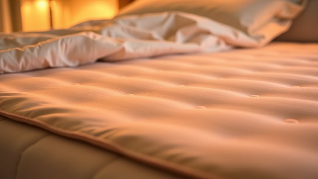 Have you ever wondered how to guarantee that your heated mattress pad is safe to use? Safety certification standards like UL, ETL, and FCC are key indicators. These certifications mean the product has passed rigorous testing for electrical safety, fire prevention, and material safety. Certified heated mattress pads often display certification labels, making it easy for you to verify compliance. Auto shutoff features are usually mandated by these standards, reducing the risk of overheating and fires during prolonged use. Choosing a product with recognized safety certifications gives you peace of mind, knowing it adheres to strict safety protocols. Always check for these labels before purchasing to ensure your safety and protect your sleep environment.