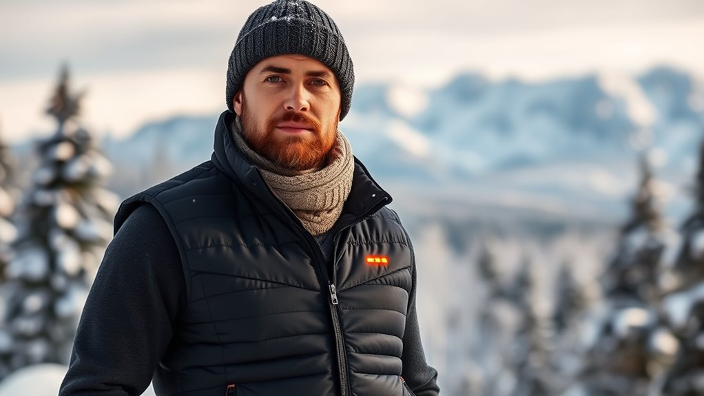 Choosing a heated vest with the right number of heating zones is essential for guaranteeing ideal warmth and comfort. The number of zones determines how much of the vest’s surface area provides heat, impacting overall heat distribution. More zones usually cover larger areas like the back, chest, and shoulders, offering thorough warmth for outdoor activities. Independent control of these zones allows me to customize the heating intensity in specific areas based on my needs. Vests with extensive coverage warm the core more evenly, reducing cold spots during long wear. Additionally, the placement and size of the heating zones influence the vest’s ability to maintain consistent temperature across my upper body. Ultimately, a well-designed zoning system ensures I stay warm and comfortable, even in the coldest conditions.