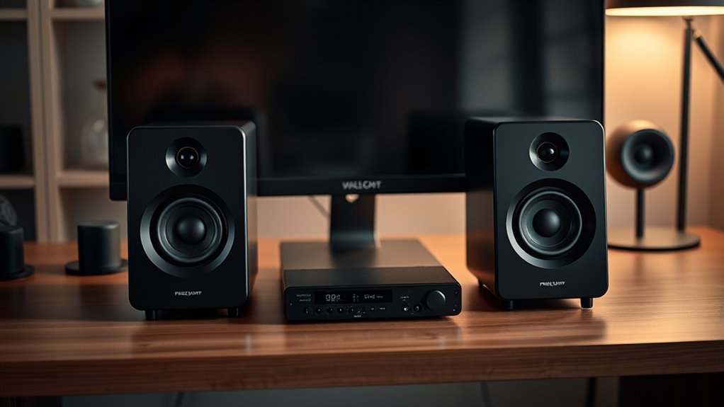 Achieving crystal-clear sound with hi-fi desk speakers depends on their ability to produce detailed audio across the entire frequency spectrum with minimal distortion. Look for speakers that deliver a balanced sound profile, accurately reproducing highs, mids, and lows without overemphasizing any range. The presence of dedicated tweeters and woofers greatly enhances clarity by precisely handling different frequency bands. A wide frequency response, typically from around 50 Hz to 20 kHz, ensures full-spectrum audio fidelity, capturing every nuance of your music. Additionally, speakers with sound tuning controls allow for customization of treble, bass, and midrange, helping you attain ideal clarity tailored to your preferences. Prioritizing these factors guarantees a listening experience where every detail shines through vividly.