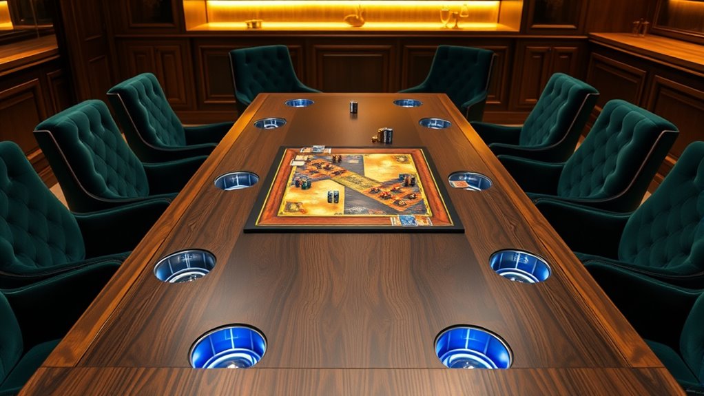Built-in storage options can substantially enhance your gaming setup by keeping pieces, cards, and accessories organized and within easy reach. Drawers, trays, or under-table compartments help reduce clutter, making gameplay smoother and more enjoyable. High-end tables often include dedicated storage for specific items like dice trays, cupholders, or game mats, ensuring everything stays neatly stored and quickly accessible. Well-designed storage maximizes space efficiency, especially helpful in smaller rooms, by integrating essentials into the table itself rather than adding extra furniture. Plus, quality storage solutions in premium tables are crafted from durable materials that match the table’s aesthetic, ensuring longevity and consistent performance. Overall, built-in storage is a key feature that elevates your gaming experience and keeps your setup tidy.