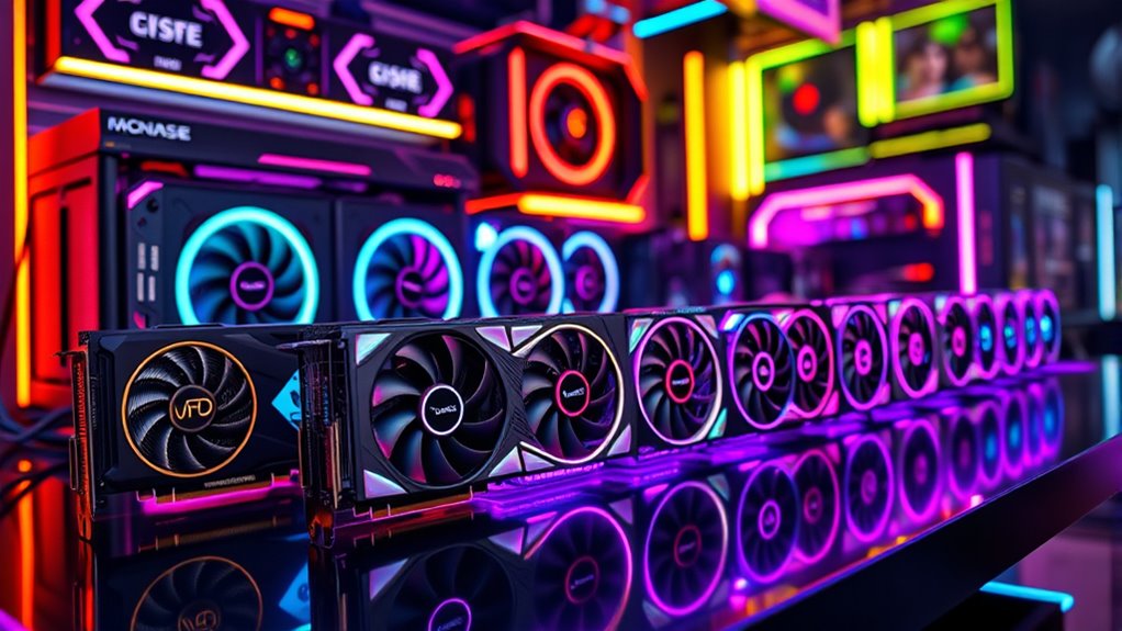 Software optimization is the secret sauce that can make or break high-end GPU performance. When developers fine-tune drivers and software, I notice smoother gameplay, faster rendering, and increased stability. It’s like giving my graphics card a turbo boost without changing the hardware. Proper optimization guarantees I get the most out of my investment, transforming raw power into truly extraordinary performance, especially in demanding games and creative applications.