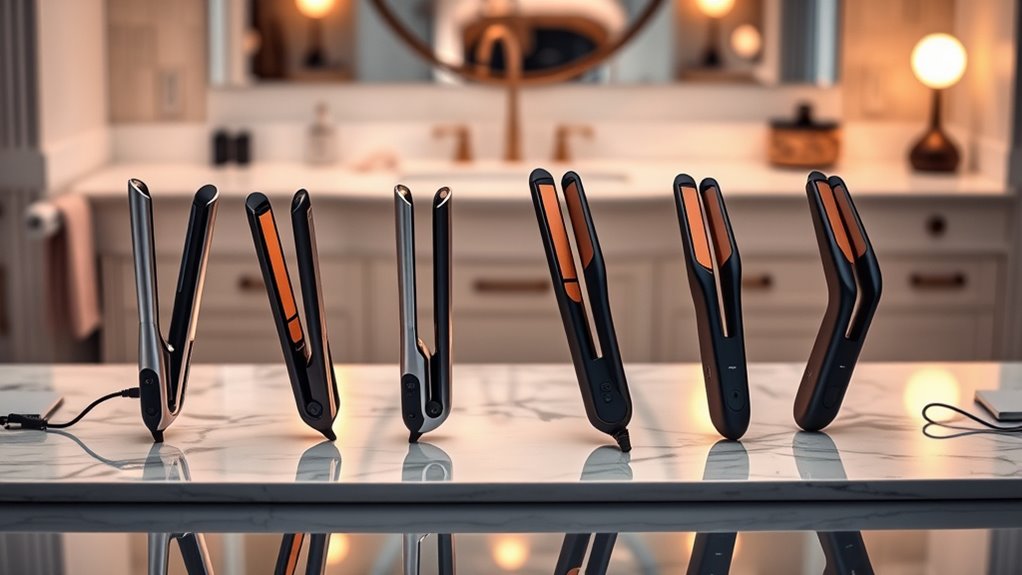 Choosing a high-end hair straightener with precise heat settings is essential for achieving ideal styling results while protecting your hair. Premium models offer multiple temperature options, usually between 250°F and 450°F, so you can customize heat levels based on your hair type. Advanced sensors like T-sensors or PTC technology monitor and adjust heat in real time, ensuring consistent temperature control. This prevents hot spots that can cause damage and guarantees uniform styling. Digital displays provide instant feedback, allowing you to select and maintain your desired temperature with minimal fluctuation. Precise heat control is especially beneficial for delicate or chemically treated hair, as it reduces the risk of overheating and damage. Overall, accurate temperature management helps you style efficiently while keeping your hair healthy.