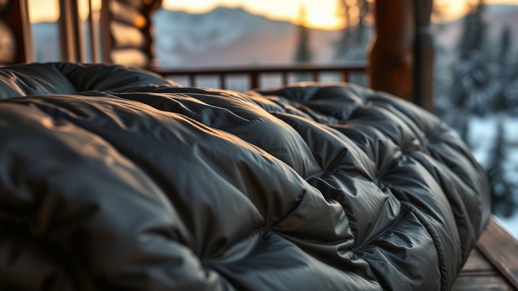 I find that features like removable, washable covers make high-end sleeping bags much easier to clean. I also look for bags with water-resistant outer shells that wipe clean easily, and those with durable, stain-resistant fabrics. Some bags even have antimicrobial treatments that reduce odors and bacteria buildup. These features save me time and effort, ensuring my luxurious sleeping bag stays fresh, clean, and ready for the next adventure.