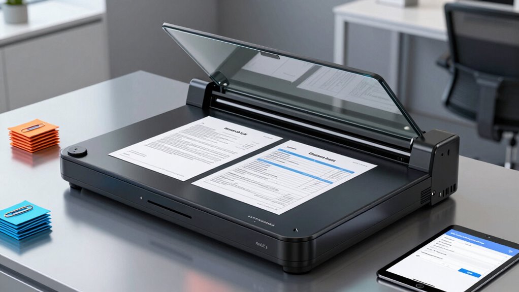 When selecting a high-speed document scanner for contracts and invoices, media handling versatility is essential to meet diverse digitization needs. A versatile scanner can process various media types like receipts, business cards, photographs, and envelopes, ensuring I capture all necessary documents. Features such as automatic document size detection and adjustable scanning profiles make it easy to handle different formats and dimensions without manual adjustments. Multi-feed sensors and skew detection help prevent paper jams and misfeeds, keeping operations smooth across different media. Additionally, support for long documents up to 118 inches and various paper thicknesses ensures I can scan complex or extended materials efficiently. Compatibility with multiple formats like JPG, PDF, TIFF, PNG, and PPTX allows me to organize and digitize a wide range of media seamlessly.