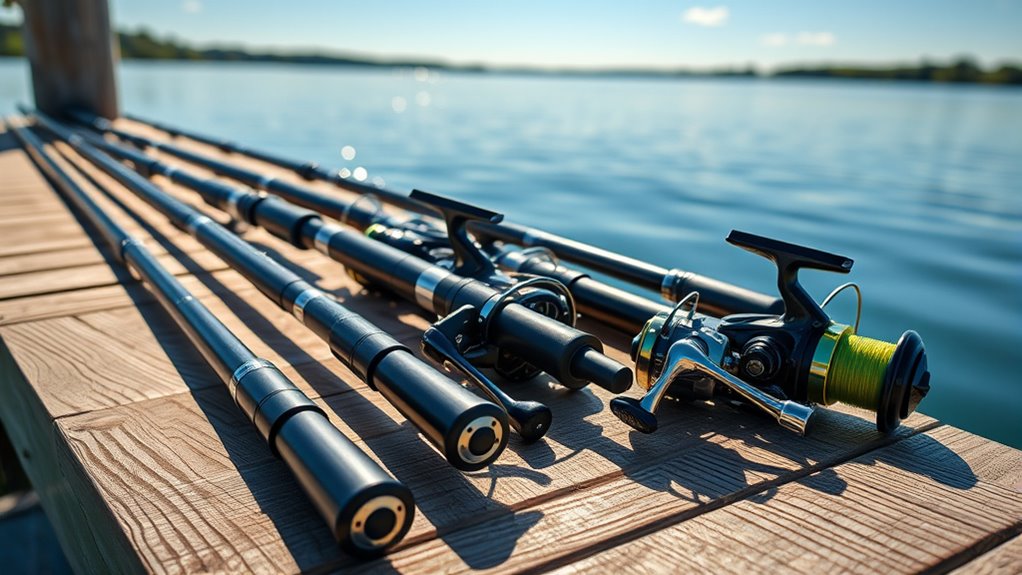 Rod flexibility plays a crucial role in how a fishing rod performs, affecting everything from casting accuracy to fight control. When a rod bends under load, it influences sensitivity and the ability to detect bites. A highly flexible rod offers better shock absorption, which reduces the risk of line breakage when battling strong fish. Conversely, moderate to stiff rods have less bend, providing more power and precision—ideal for techniques like jigging or heavy trolling. The action rating, such as fast, medium, or slow, indicates how quickly a rod bends, guiding your choice based on your targeted species and conditions. Softer rods are perfect for finesse fishing, while stiffer ones excel in heavy-duty scenarios. Selecting the right flexibility ensures better control and enhances your overall fishing experience.