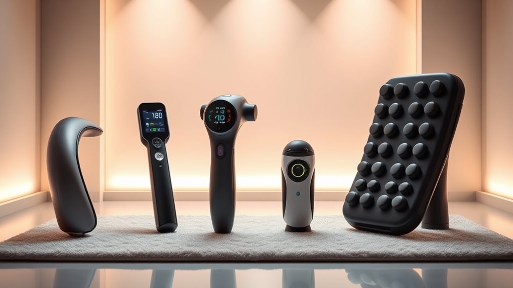 When choosing a fitness massager, considering its design and portability can make a significant difference in your overall experience. High-end models often feature a compact, ergonomic shape that fits comfortably in my hand, making extended use easier. Their lightweight construction and cordless operation allow me to take them anywhere without hassle. Many include adjustable handles or detachable parts, helping me reach hard-to-access muscle groups efficiently. Built-in rechargeable batteries support multiple sessions, so I don’t have to worry about frequent recharging. Additionally, sleek, durable materials combined with user-friendly controls create a seamless experience whether I’m at home or on the go. These thoughtful design elements ensure that my massage device is both practical and effective, fitting smoothly into my busy lifestyle.