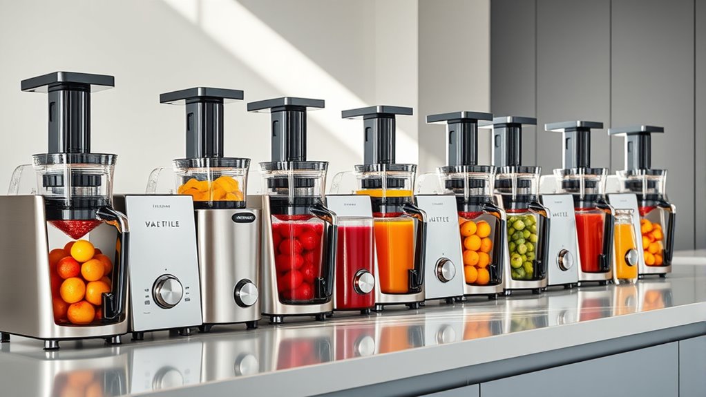 High-end juicers excel at nutrient retention because they use slow, cold-press extraction methods that minimize heat and oxidation. I’ve found that these machines preserve more vitamins, enzymes, and antioxidants compared to standard juicers. Their superior design guarantees you get maximum nutritional value from your fruits and vegetables, making your juice healthier and more vibrant. If you want the best quality and nutrition, investing in a high-end juicer is definitely worth it.