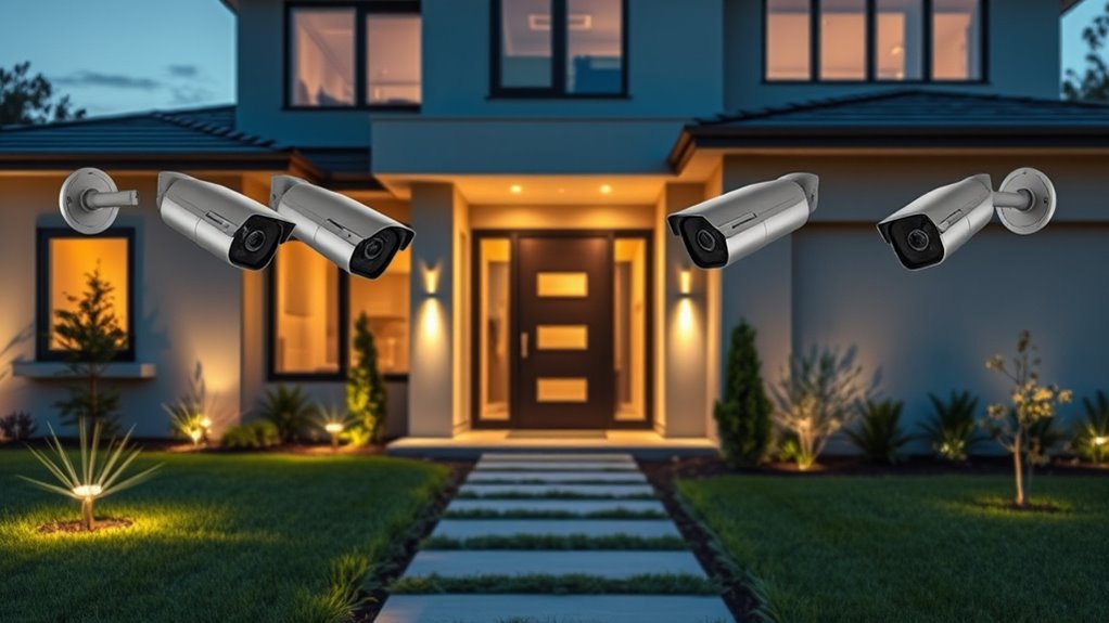 Security cameras handle privacy and data security by encrypting footage, restricting access, and regularly updating software. I make sure to choose systems with strong encryption and customizable privacy settings. I also review privacy policies to understand how my data is stored and shared. By being vigilant about these features, I can protect my personal information while keeping my property safe, giving me peace of mind knowing my data is secure.