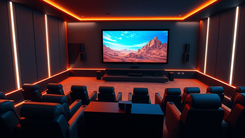 Looking to upgrade your movie nights in 2025? I recommend exploring the top home theater systems that deliver immersive sound and stunning visuals, like Yamaha’s YHT-4950U, Sony’s HT-S60, and the versatile ULTIMEA models. These setups include everything from soundbars and wireless options to full multi-channel systems with Dolby Atmos. If you want to discover more about the best choices to transform your home entertainment, keep going to find out which system suits your space and budget best.