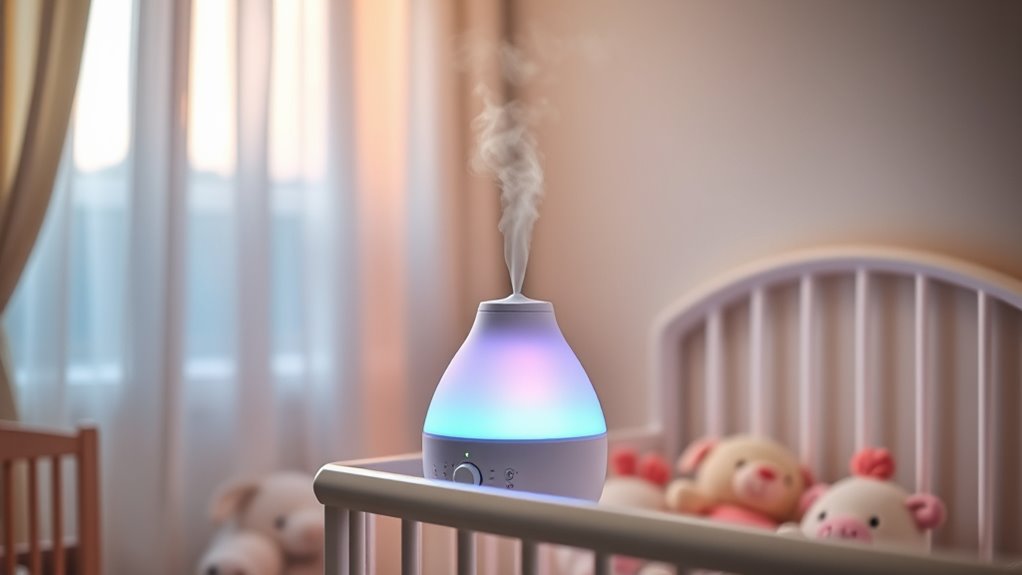 Think of choosing a humidifier for your baby’s room like tending to a delicate garden. With the right tool—like a gentle rain nourishing tiny sprouts—you create a cozy, healthy environment where your little one can thrive. By picking the perfect humidifier with a night light, you’re watering their comfort and safety, helping them grow strong and peaceful through every night. Trust me, your baby’s restful sleep will bloom beautifully with the right touch.
