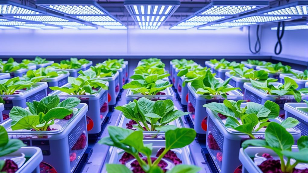 Lighting and spectrum are pivotal factors that can greatly influence the success of your hydroponic system. Full-spectrum LED grow lights deliver a balanced range of wavelengths, supporting all growth stages from germination to flowering. You can alter the spectrum to optimize photosynthesis—blue light encourages vegetative growth, while red light promotes flowering and fruiting. The intensity and duration of light, typically around 16 hours daily, directly impact plant health and yields. Proper light positioning, often with adjustable heights, prevents light burn and stretch. Many advanced systems include programmable timers and spectrum controls, allowing you to customize lighting for specific plants and growth phases. Choosing the right lighting setup ensures your indoor garden thrives, maximizing growth and productivity.