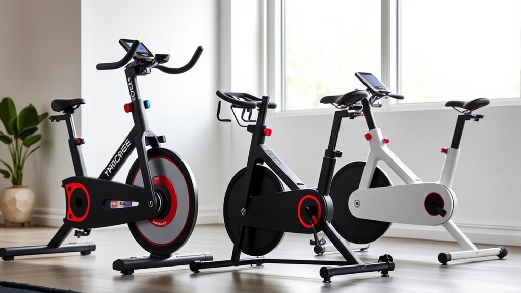 Connectivity and features play a crucial role in enhancing your indoor cycling experience, as they allow you to track progress, stay motivated, and access interactive content. Many bikes come with Bluetooth connectivity, enabling seamless syncing with fitness apps for real-time data like speed, distance, calories, and heart rate. Some models have tablet mounts or built-in screens, making virtual classes or engaging visuals easily accessible. Digital displays keep essential workout metrics visible at all times, helping you monitor your performance closely. Advanced features, such as automatic resistance adjustment and immersive virtual environments, are often available through smart device integration, creating a more engaging workout. These connectivity options not only boost motivation but also help tailor your training, making your home cycling sessions more interactive and effective.
