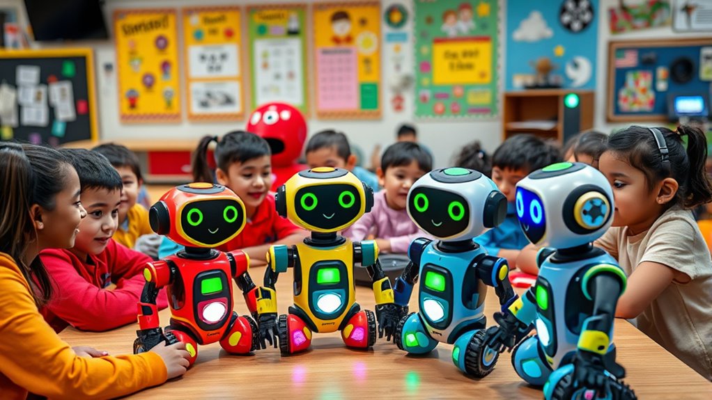 Looking for fun, interactive coding robots to make learning engaging? I’ve found that the best options include devices like Thames & Kosmos’ Coding Chameleon, Ozobot Evo, Botley, Sphero Mini, and Ruko 1088. These robots support various ages, offer hands-on building, and use multiple coding styles—from block-based to Python. They also feature expressive behaviors and creative challenges. Keep exploring, and you’ll discover which one fits your child’s interest and skill level perfectly.