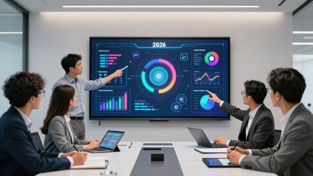 When selecting an interactive whiteboard for marketing planning, I consider factors like screen size to guarantee everyone can see clearly and touch responsiveness for smooth collaboration. Compatibility options are vital so the device integrates seamlessly with existing tools, while ease of installation saves time and effort. Ultimately, I look at the app ecosystem to find options that enhance productivity and creativity during planning sessions.