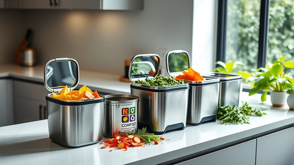 If you’re looking to turn kitchen scraps into garden gold, I recommend exploring the 14 top composters and food cyclers I’ve found. These models range from compact units like the Food Cycler Eco 3 to larger, more automatic options such as the GEME Bio Smart Composter. They’re odorless, easy to use, and excellent at reducing waste fast. Keep exploring to find out which one fits your space and lifestyle perfectly.