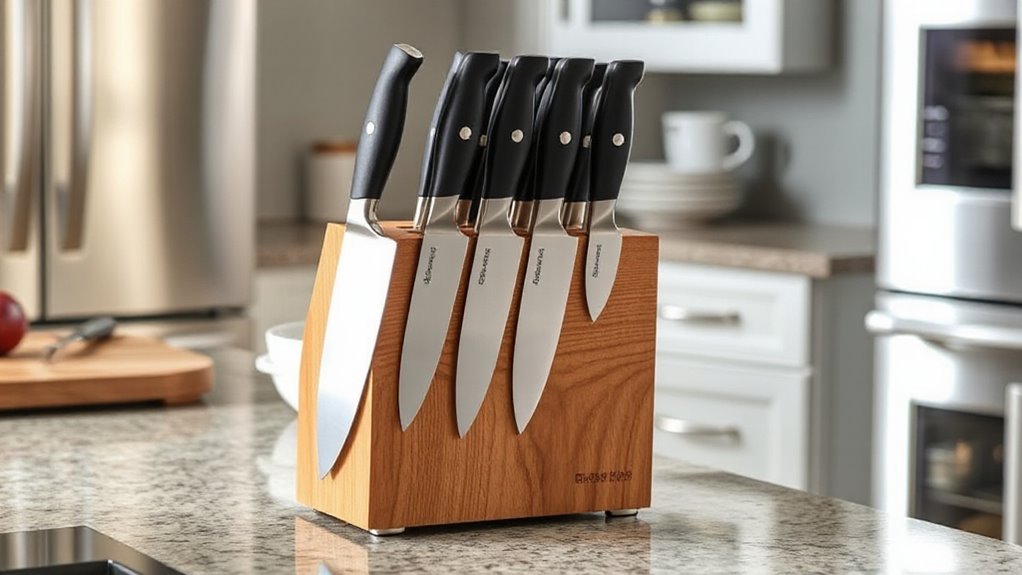 Selecting the right knife block set means paying close attention to storage capacity and size to guarantee it fits your kitchen needs. I recommend considering how many knives the set includes to avoid overcrowding your storage space. Measure the dimensions of the block to ensure it fits comfortably on your countertop or in your drawer. It’s also important to evaluate the internal slots to accommodate different knife sizes and types, reducing the risk of damage and making access easier. Some sets come with extra features like built-in sharpeners or utensil compartments, which can be a bonus if you want additional storage options. Striking a balance between capacity and compactness helps maximize space without sacrificing organization, keeping your kitchen tidy and your knives easily accessible.