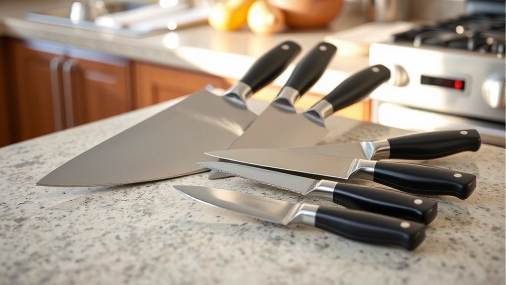 Ever wondered what makes a knife set truly perform at its best? It all comes down to blade sharpness and edge quality. High-quality knives should have a finely ground blade edge, ideally at a 15° or 20° angle, for precise, effortless cuts. The steel type matters too—high-carbon stainless steel keeps that sharp edge longer and resists corrosion. Look for knives with tapered grind technology or laser-cut blades, as these features boost sharpness and make sharpening easier. Regular honing and proper maintenance are *essential* for maintaining edge performance over time. The initial sharpness and how well the blades retain their edge are key factors that determine how easily and efficiently you can handle your kitchen tasks. Sharp, well-maintained blades truly elevate your cooking experience.