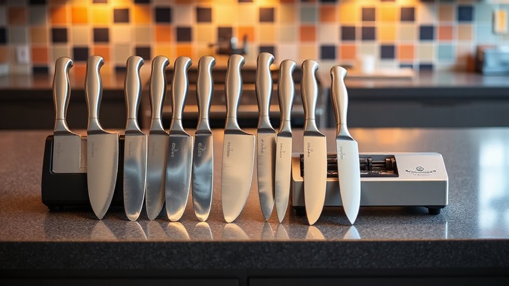 Choosing the right knife set with a sharpener begins with understanding blade material quality, as it directly impacts performance and longevity. High-carbon stainless steel blades are top-tier because they combine sharpness, durability, and corrosion resistance. German stainless steel, like 1.4116, is especially respected for its excellent edge retention and rust resistance, making it a favorite among professionals. Blade coatings, such as non-stick or anti-rust finishes, can help extend the lifespan but shouldn’t compromise sharpness or ease of sharpening. Full tang construction with high-quality steel provides better balance and strength, reducing breakage risk during heavy use. Additionally, blades featuring laser patterns or taper grind technology help maintain sharpness and make re-sharpening easier, ensuring your knives stay sharp longer.