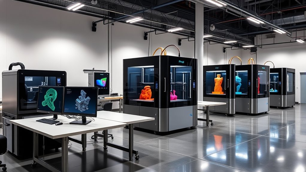 Choosing a large-format 3D printer hinges on understanding its build volume capacity, as this directly impacts what you can produce in a single print. A bigger build volume allows you to print larger models in one piece, reducing assembly and post-processing time. High-volume printers often feature dimensions over 300x300x300mm, supporting substantial projects. Additionally, a larger build space lets you print multiple smaller parts simultaneously, boosting productivity. However, expanding the build size may require a sturdier frame and precise auto-leveling systems to maintain quality. It’s crucial to match the build volume with your specific project needs to guarantee efficient production without compromising accuracy. Carefully evaluating your typical model size and production goals helps you choose a printer that balances capacity and performance effectively.