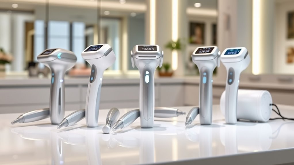 Selecting a laser hair removal device that’s easy to operate can make your treatment sessions more comfortable and effective. Devices with intuitive interfaces, like digital touchscreens or simple buttons, help you navigate settings effortlessly. Adjustable energy levels and multiple modes let you customize treatments based on your comfort and skin sensitivity. Corded models ensure consistent power without interruptions, while cordless options offer greater freedom to move around. Clear instructions and safety features, such as skin sensors and auto shut-off, promote safe use and confidence. Some devices even include automatic flash modes or auto-reloading cartridges, which streamline the process and save time. Overall, choosing a user-friendly device makes at-home treatments more convenient, safe, and effective.