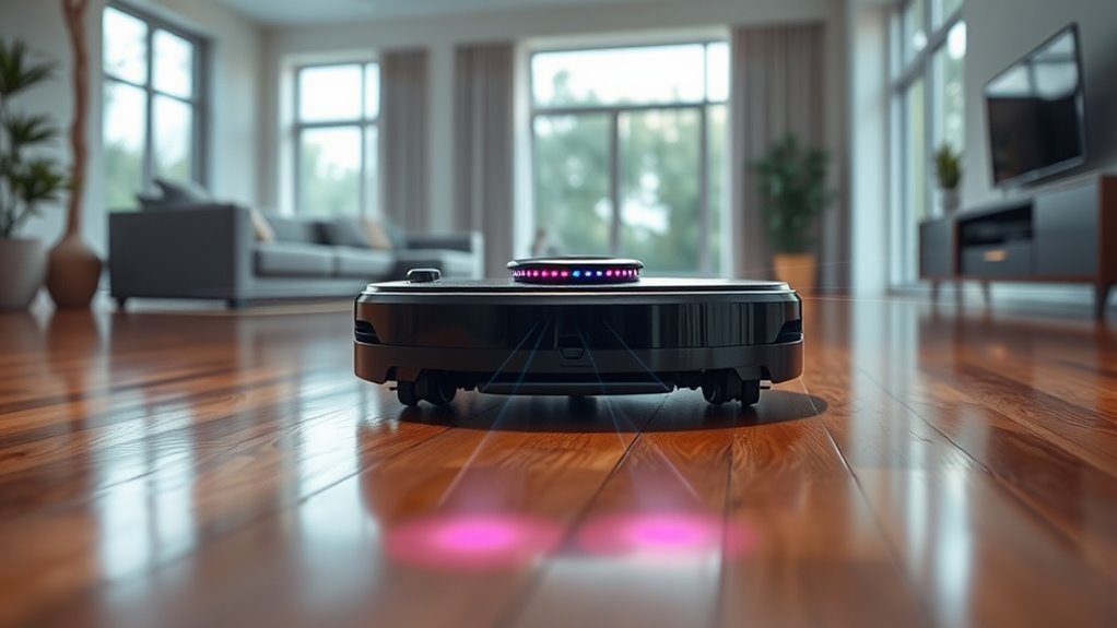 Lidar sensors improve navigation accuracy by creating detailed 3D maps of my environment. They use laser beams to measure distances precisely, allowing me to detect obstacles and plan efficient routes. This real-time data helps me avoid collisions and adapt to changes in the layout. With lidar, I navigate smoothly and thoroughly, ensuring every corner gets cleaned without missing spots or bumping into furniture.