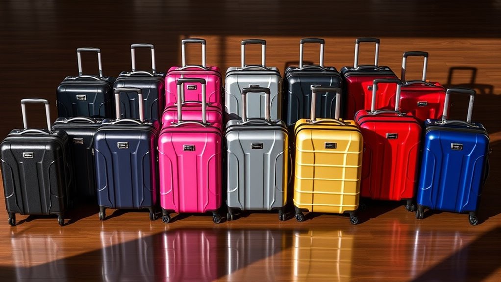 Choosing a lightweight 20-inch hardside carry-on means finding the right balance between weight and durability. I look for models that weigh between 5.5 to 7.5 pounds, offering portability without sacrificing protection. Materials like ABS and polycarbonate are popular because they provide impact resistance without adding unnecessary weight. Sometimes, slightly heavier options offer stronger shells and better impact protection, which can be worth considering. It’s also smart to check for sturdy handles, reinforced corners, and quality zippers, as these features enhance durability without considerably increasing weight. Ultimately, I want a bag that meets airline weight limits while keeping my belongings safe during travel. Striking this balance ensures I don’t compromise on convenience or protection.