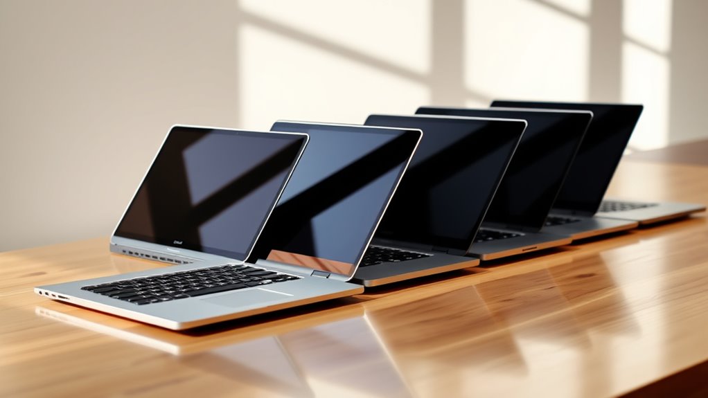 Ever wondered what makes a lightweight ultrabook truly portable? It’s primarily about weight and size. Ultrabooks usually range from 2 to 4 pounds, with models around 2-3 pounds being ideal for carrying all day. If it weighs less than 3 pounds, I find it much easier to handle during travel or daily commutes. Thickness also matters—most ultrabooks are under 0.8 inches, so they slip easily into backpacks or small bags. However, lighter models often have smaller batteries, which can impact how long they last without charging. The materials used, like magnesium or aluminum, help keep weight down without sacrificing durability. Overall, balancing lightness with design and battery capacity is key to choosing a truly portable ultrabook.