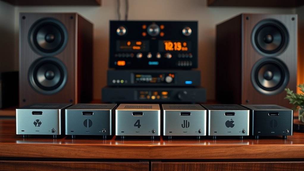 For seamless, high-fidelity audio, I recommend considering lossless NAS streamers like the Bluesound Vault 2i, which offers a 2TB drive plus support for multiple formats and streaming services. The WiiM Mini and WiiM Pro are great for multi-room setups with AirPlay 2 and other protocols, while the S.M.S.L DP5SE provides studio-quality sound. The M5 AudioCast delivers versatile wireless streaming, and ELAC’s solution is worth exploring. Keep exploring to find the best fit for your audiophile needs.