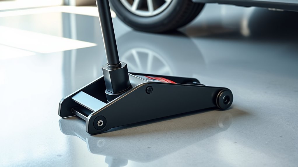 The low-profile aluminum floor jack’s design is essential for accessing vehicles with low ground clearance. With a reduced minimum height between 2.5 to 4 inches, these jacks easily slide under low-slung cars, saving time and effort. Their slim profile also enhances maneuverability in tight spaces, making positioning more precise. The lightweight aluminum construction not only makes handling easier but also simplifies transportation, ideal for frequent use or professional environments. A wide lifting range allows these jacks to accommodate various vehicle heights while maintaining a low starting point. Additionally, the low-profile design improves stability during lifting, decreasing the risk of tipping or slipping. Overall, this design feature guarantees safer, more efficient lifting for vehicles with minimal ground clearance.