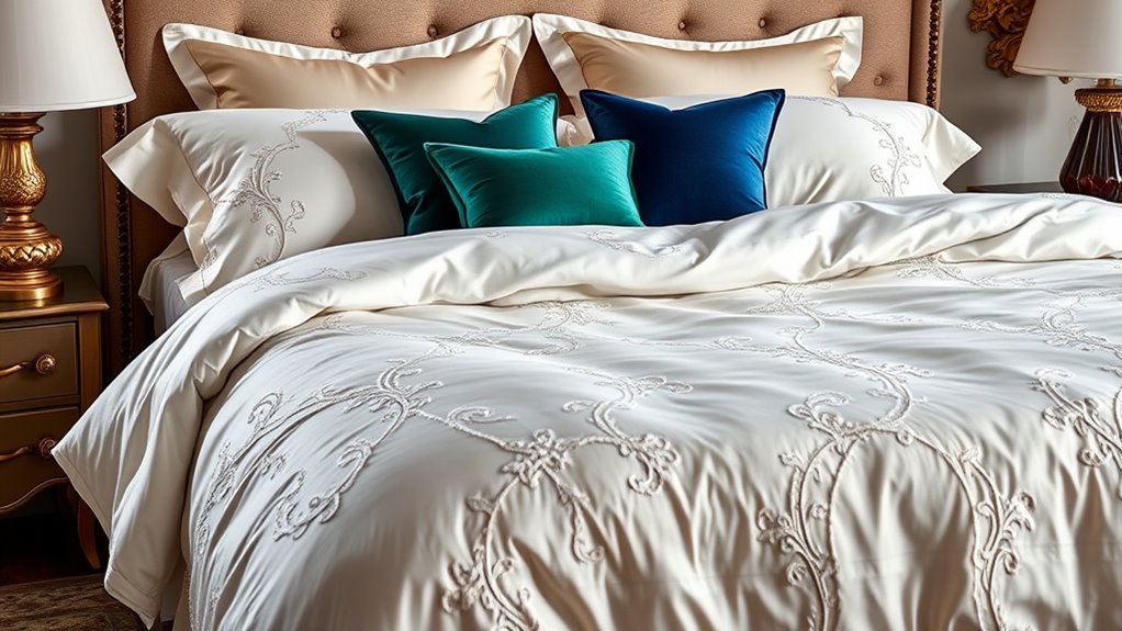 To keep my luxury bedding looking its best, I always follow the care instructions carefully. I use gentle detergents and wash on a delicate cycle, avoiding bleach. I also avoid over-drying and instead air-dry or use a low heat setting. Regularly fluffing and rotating my bedding helps maintain its softness and shape. These simple steps guarantee my luxury bedding stays plush, fresh, and beautiful for years.