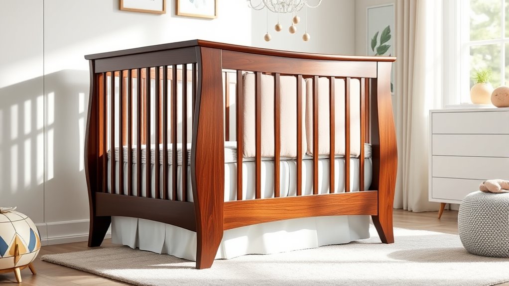 Yes, many luxury convertible cribs are eco-friendly and sustainably sourced. I always look for cribs made from FSC-certified or reclaimed wood, which guarantees responsible harvesting. Brands often prioritize non-toxic finishes and safe materials, giving me peace of mind. I love finding options that combine style with sustainability, so I can create a beautiful, eco-conscious space for my little one without compromising on quality or design.