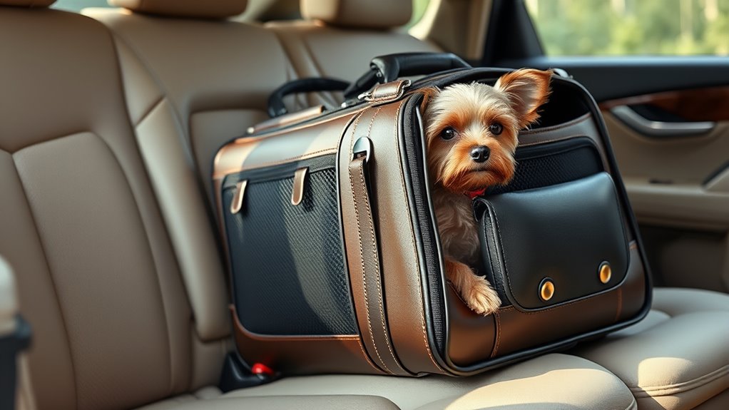 A well-ventilated luxury dog carrier is essential for guaranteeing your pet’s comfort and safety during travel. Multiple mesh panels or windows promote airflow and help regulate temperature, preventing overheating. Proper ventilation also allows your dog to see outside, which reduces stress and anxiety. Some carriers feature adjustable vents or expandable sides, enhancing airflow and accommodating different pet sizes and comfort preferences. Using breathable, non-toxic fabrics ensures a breathable environment while maintaining durability and safety. Adequate ventilation helps prevent suffocation, especially in warm or enclosed travel conditions. When choosing a carrier, prioritize those with well-designed ventilation features to keep your pet comfortable, relaxed, and secure throughout your journey.