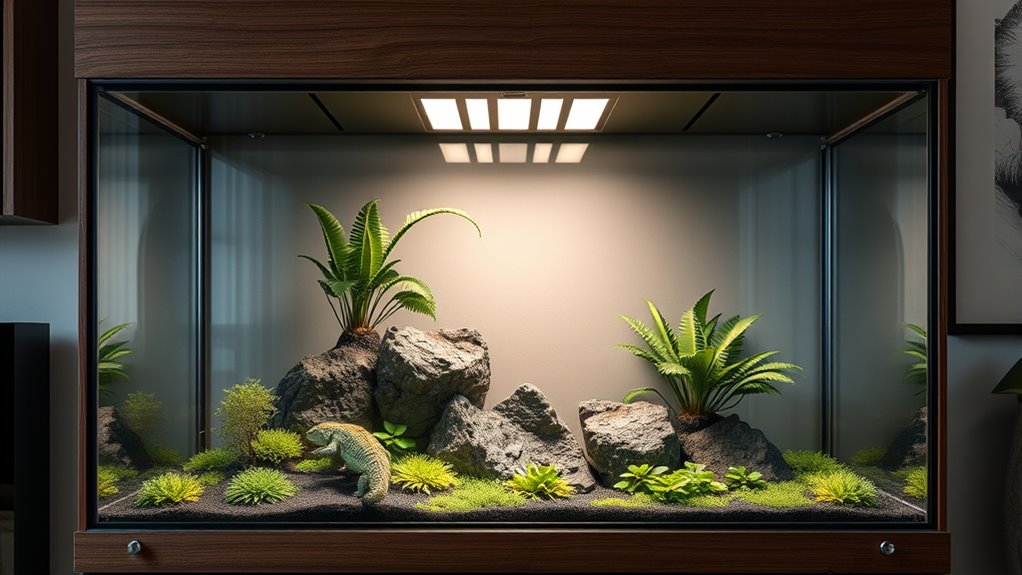 Lighting and heating are the backbone of a healthy reptile habitat, and choosing the right options can considerably impact your pet’s well-being. Luxury terrariums often feature adjustable heating elements like under-tank heaters, heat lamps, or ceramic heaters to create ideal temperature gradients essential for thermoregulation. They also include specialized lighting such as UVB bulbs combined with infrared heat sources, which promote healthy metabolism and natural behaviors. Many high-end terrariums incorporate automated thermostats and timers, allowing precise control over lighting and heating cycles that mimic natural day-night patterns. Proper lighting setup is crucial for species-specific needs, with options for full-spectrum lighting that supports UVB and UVA exposure. Together, these systems ensure a stable environment, reduce stress, and boost overall health.