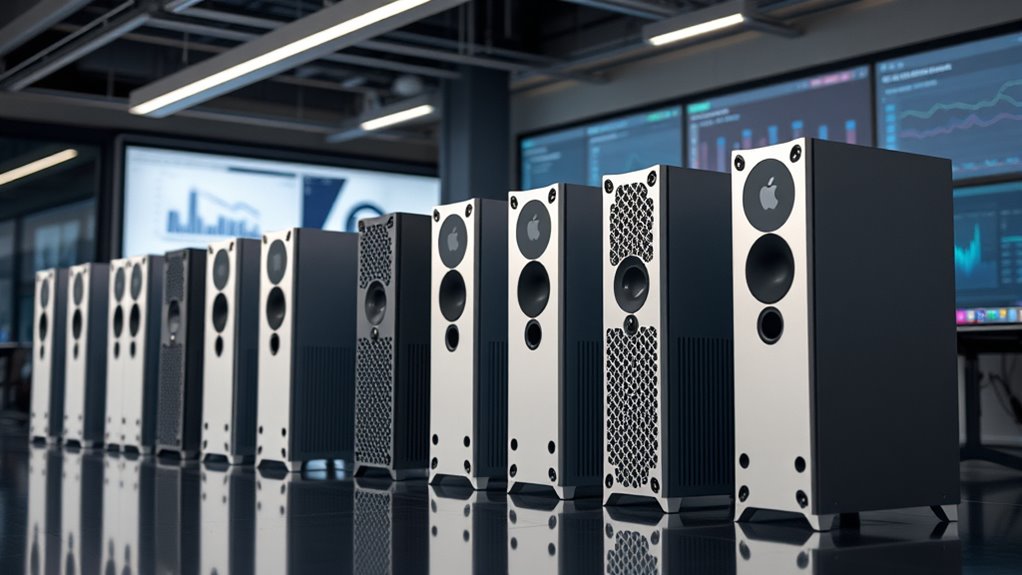 Choosing a Mac Pro for enterprise IT deployments means evaluating how well it integrates within the Apple ecosystem, guaranteeing seamless connectivity and collaboration across devices. Apple’s ecosystem features like iPhone Mirroring, AirDrop, and Universal Clipboard make data transfer quick and effortless, boosting productivity. Compatibility with proprietary services like iMessage, FaceTime, and iCloud ensures secure communication and smooth data sharing across all enterprise devices. Native support for managed device configurations and enterprise-specific apps allows centralized control, security, and deployment. Deep integration with Apple’s security infrastructure, including Apple Business Manager and Device Enrollment Program, streamlines device provisioning and management. This ecosystem integration helps create a unified, efficient environment, reducing administrative overhead and enhancing operational consistency throughout the enterprise.