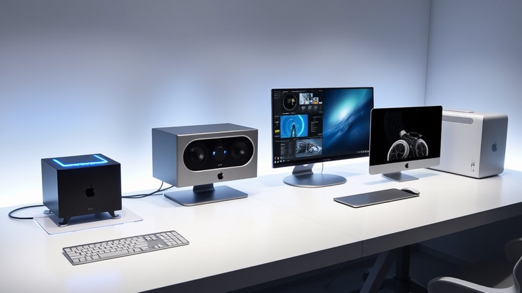 If you’re after the best Mac Studio setups of 2025, I recommend configurations with the latest M4 chips, like the 10-core CPU and 10-core GPU options, plus ample RAM and storage. For power and speed, go for the M4 Pro with a 12-core CPU, 16-core GPU, and up to 64GB RAM, paired with large SSDs. Compact, versatile, and future-proof, these setups fit demanding workflows. If you want to see how to customize each for your needs, keep exploring further.