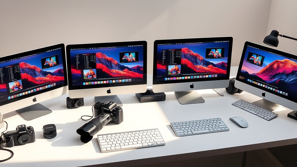 After ensuring my Mac Studio has enough processing power, I focus on display compatibility to make the most of my photography workflow. I check that it supports high-resolution displays, like 6K at 60Hz or 8K at 60Hz, for accurate color and detail. Compatibility with multiple display types—Thunderbolt 4, HDMI 2.1, and DisplayPort 2.1—is essential to connect different monitors seamlessly. I also verify how many displays the Mac Studio can support simultaneously—up to three—allowing a versatile multi-monitor setup. Ensuring the ports match my existing or planned monitors prevents connection issues. Ultimately, I consider the color accuracy and calibration capabilities of my displays, which are vital for professional photo editing and color grading.