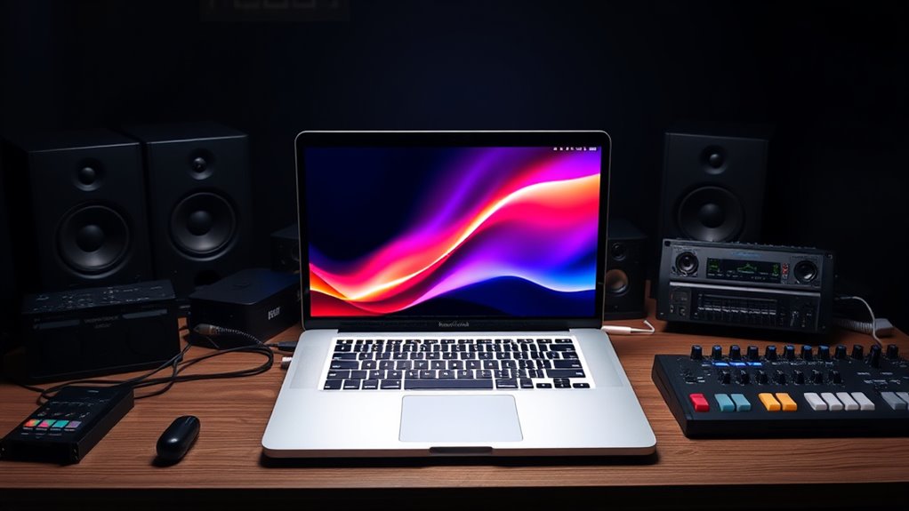 Since macOS forms the foundation for most professional music production software, ensuring your MacBook Pro runs the latest version is essential for compatibility and security. This guarantees support for popular DAWs like Logic Pro, Ableton Live, and Pro Tools. It’s also important to verify compatibility with audio interfaces and MIDI controllers, which often depend on specific drivers available on macOS. Seamless integration with other Apple devices and services, such as iCloud and AirDrop, can notably streamline your workflow. Additionally, check that your MacBook’s hardware, including RAM and storage, meets the demands of large audio files and multiple plugins. Ensuring the system supports the latest software updates and plugin formats keeps your setup future-proof and fully compatible with evolving music production tools.