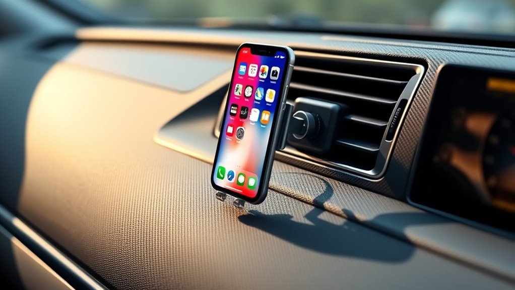 Since adjusting your phone’s position is essential for safe driving, it’s important to look for mounts with full 360° rotation. This feature allows you to easily switch between portrait and landscape modes, guaranteeing ideal viewing angles. Look for models with multi-axis pivot or ball joints; these provide smooth, precise adjustments and make repositioning effortless. Durability is key—make sure the rotation mechanism can withstand frequent adjustments without loosening or breaking over time. Some mounts offer quick, one-handed adjustments, which is a huge plus for convenience while driving. However, be aware that certain mounts may have rotation limits, preventing them from reaching exactly 90°, which could restrict some viewing positions. Prioritizing adjustability helps ensure your phone remains accessible and safe at all times.