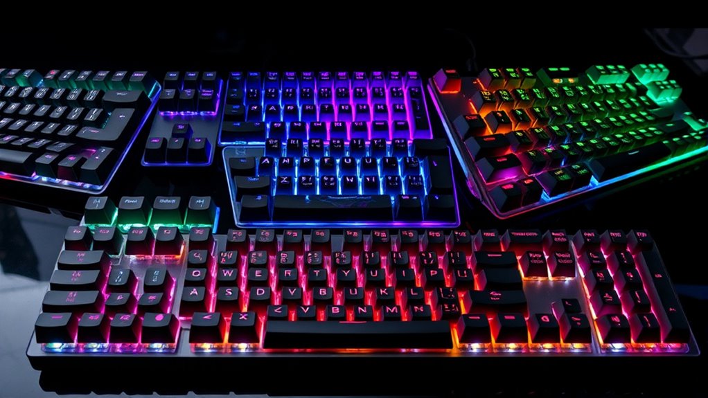 Imagine the gentle hum of your keyboard; that’s how switch types influence sound and feel. Linear switches offer smooth, quiet keystrokes, perfect for a serene workspace. Tactile switches give you a satisfying bump, making typing more engaging. Clicky switches produce audible feedback, adding a lively rhythm to your typing. Your choice depends on whether you prefer whisper-quiet, tactile reassurance, or lively feedback—each switch type shapes your typing experience uniquely.
