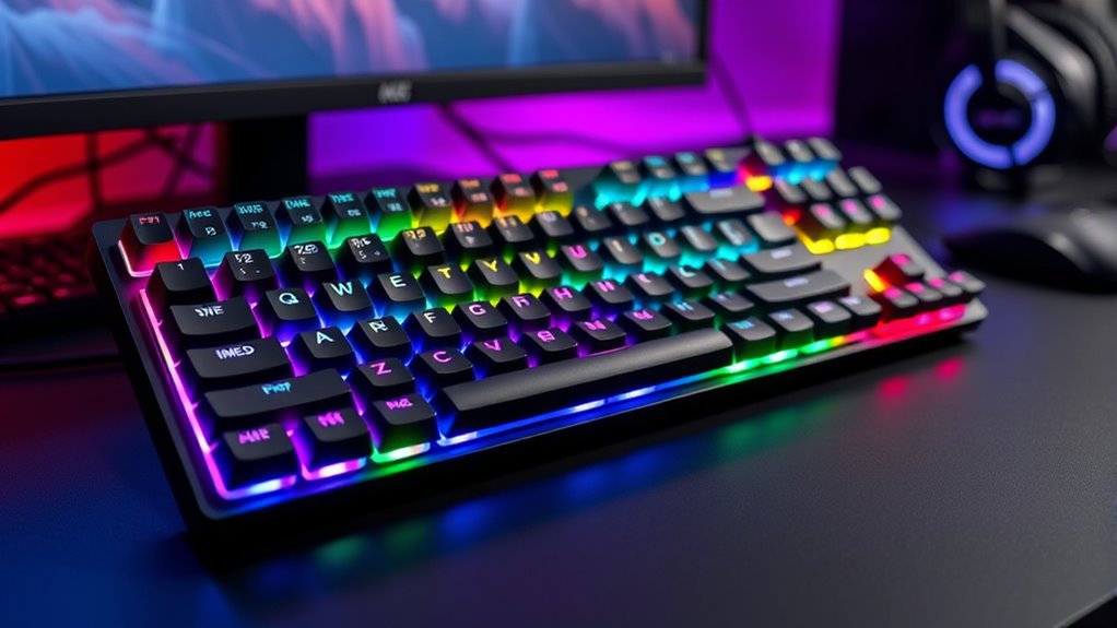 When choosing a mechanical keyboard, considering its customization capabilities can considerably enhance your experience. Many models feature hot-swappable switches, letting you change switches easily for different feels and sounds without soldering. This is perfect if you like experimenting or want to upgrade later. Macro programming and key remapping are also common, allowing you to create shortcuts that boost productivity or streamline gaming commands. Adjustable backlighting modes and brightness levels help you personalize the look and visibility to match your environment. Some keyboards even offer customizable keycaps and RGB lighting effects, giving you control over aesthetics and illumination patterns. Firmware updates or dedicated software expand these options further, enabling you to craft unique profiles and effects that suit your style and needs.